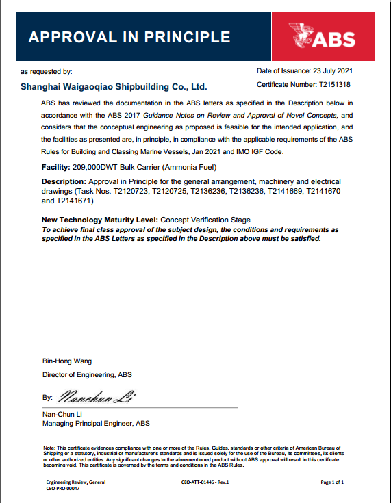 外高橋造船氨燃料動力21萬噸散貨船獲ABS認證