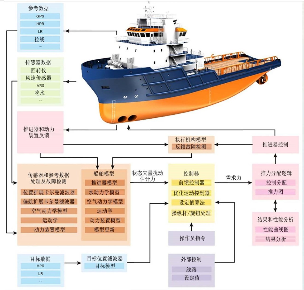 DP系統(tǒng)是一種多學(xué)科高度融合的技術(shù)密集型復(fù)雜系統(tǒng)。它采集全船關(guān)鍵數(shù)據(jù),通過控制船舶各推進器,使船舶依照操作者的指令循跡、保持位置或艏向,廣泛應(yīng)用于平臺支持船、遠洋科考船、海洋鉆井船、布纜船、救援船、拖船等特種船舶領(lǐng)域。