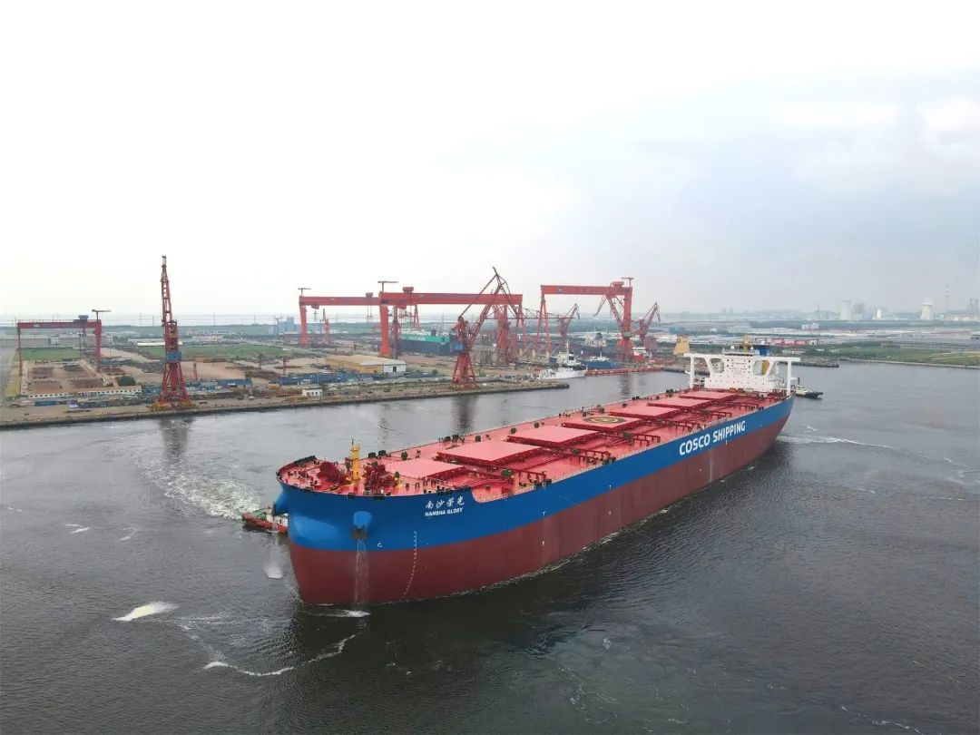 8月14日,新港船舶重工為中國礦運有限公司建造的32.5萬載重噸礦砂船“南沙榮光”離廠試航。