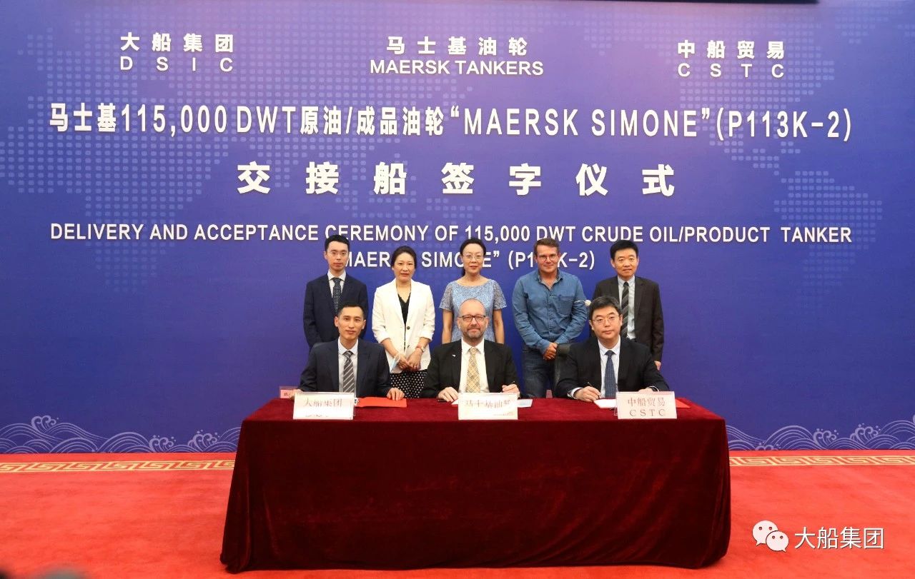 8月18日,中國(guó)船舶集團(tuán)大船集團(tuán)為馬士基油輪建造的11.5萬(wàn)噸原油/成品油船“MAERSK SIMONE”輪簽字交付。