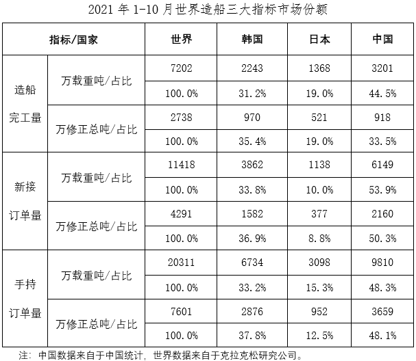 1~10月,我國造船完工量、新接訂單量、手持訂單量分別占世界市場份額的44.5%、53.9%和48.3%。