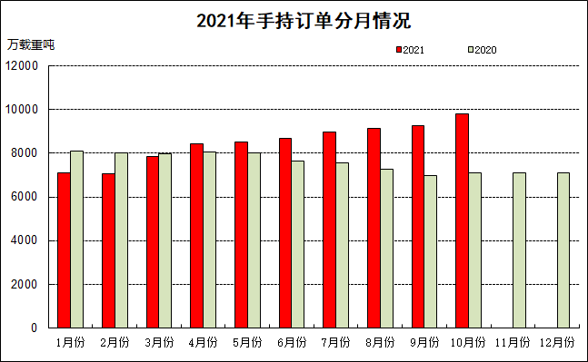 1~10月,全國造船完工3201萬載重噸,同比增長5.0%。承接新船訂單6149萬載重噸,同比增長210.5%。10月底,手持船舶訂單9810萬載重噸,同比增長38.2%,比2020年底手持訂單增長37.9%。
