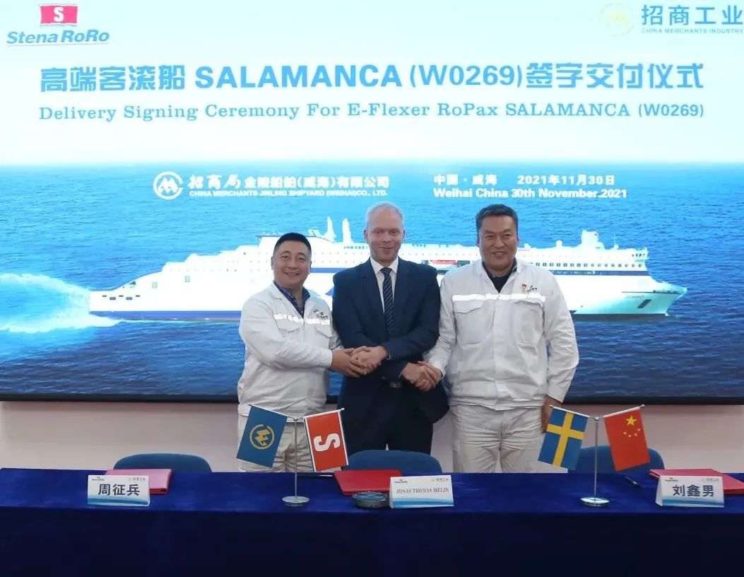 11月30日,威海金陵船廠交付E-Flexer系列首艘雙燃料客滾船SALAMANCA,這是公司交付的第6艘高端客滾船,也是國(guó)內(nèi)首艘EEDI指數(shù)達(dá)到第三階段并實(shí)現(xiàn)按期交付的雙燃料客滾船。