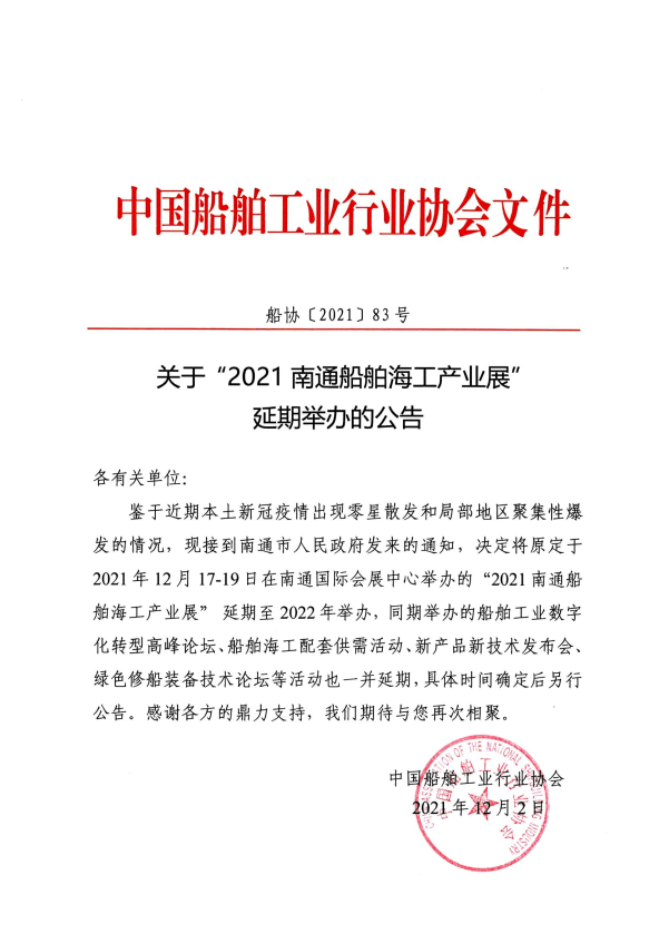 附件:關(guān)于 “2021南通船舶海工產(chǎn)業(yè)展”延期舉辦的公告