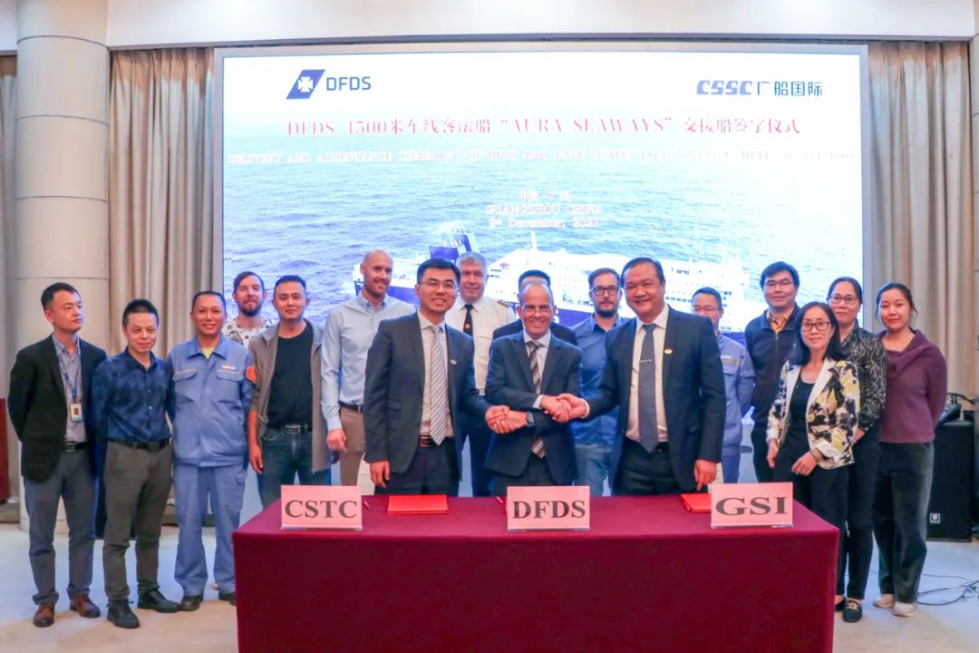 12月9日,中國船舶集團(tuán)旗下廣船國際聯(lián)合中船貿(mào)易為丹麥DFDS航運(yùn)公司建造的600客/4500米車道豪華客滾船首制船實(shí)現(xiàn)“云交付”。廣船國際副總經(jīng)理歐傳杰代表公司與DFDS駐廠監(jiān)造組組長(zhǎng)Steen Haurum和中船貿(mào)易高級(jí)商務(wù)經(jīng)理陳銳簽署交船文件