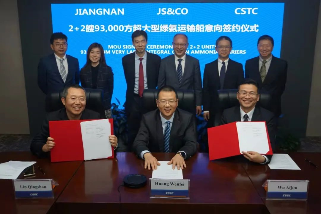 12月10日,中國船舶集團江南造船聯(lián)合中船貿(mào)易與投資公司JS & Co簽署了2+2艘93000立方米超大型綠氨運輸船(VLAC)合作備忘錄。
