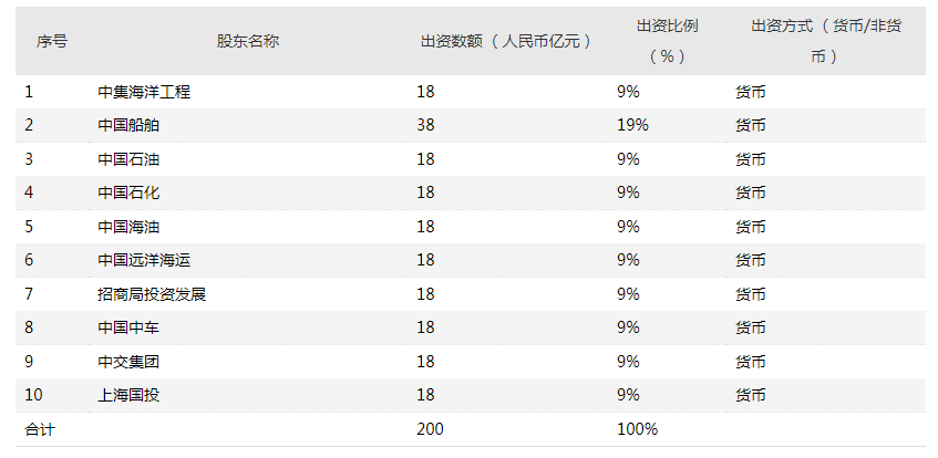中國海工技術(shù)公司背靠央企國企。根據(jù)公告,中國船舶出資金額最高,為38億元,占合資公司19%的股份,出資方式為貨幣出資;中集海洋工程及其他參股公司均出資18億元,各占合資公司9%的股份,出資方式為貨幣出資。