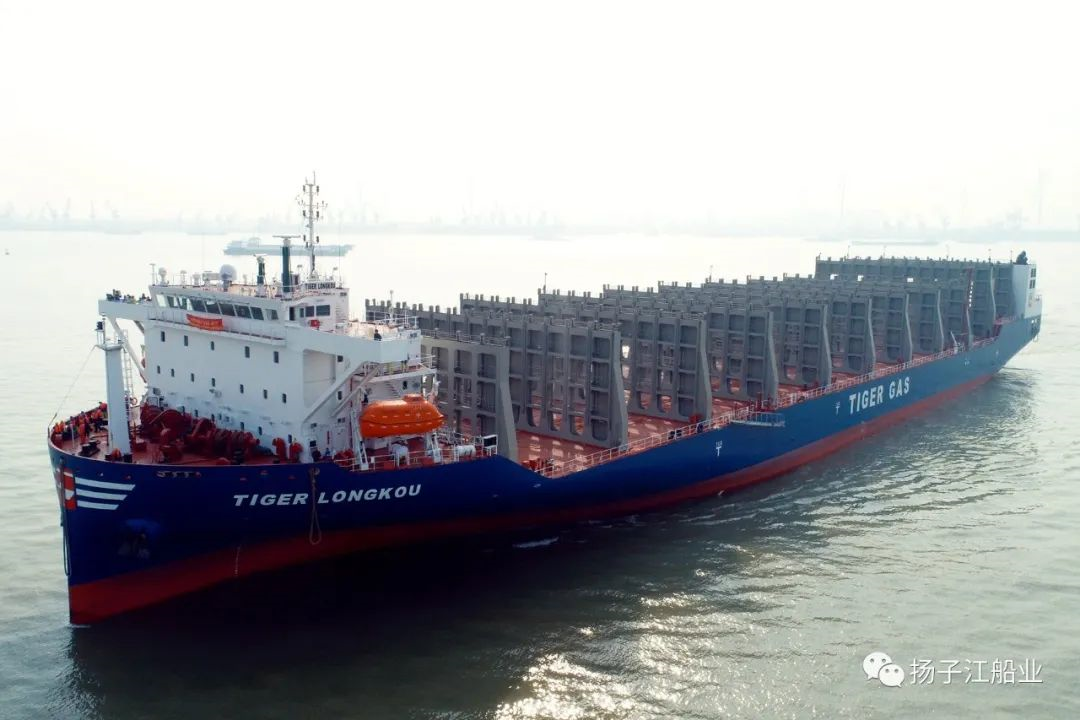 1月6日,揚子江船業(yè)為老虎燃?xì)饨ㄔ斓?00箱級LNG罐箱甲板船“TIGER LONGKOU”輪交付。