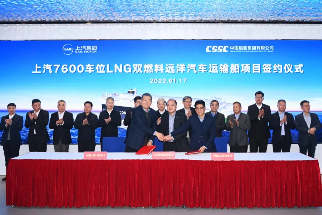 1月17日,中國船舶集團(tuán)旗下江南造船攜手中船貿(mào)易與上汽集團(tuán)下屬安吉物流簽訂2艘7600車位LNG雙燃料遠(yuǎn)洋汽車運(yùn)輸船建造合同。中國船舶集團(tuán)有限公司董事長、黨組書記雷凡培,上汽集團(tuán)黨委書記、董事長陳虹,上海市軍民融合發(fā)展委員會(huì)辦公室常務(wù)副主任吳磊,上汽集團(tuán)總裁王曉秋等出席簽約儀式。