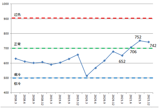 四季度,國際航運市場高位震蕩回落,新船價格指數慣性上漲,重點監(jiān)測造船企業(yè)手持訂單充足,生產任務飽滿,但企業(yè)效益同比下降。年末CCI回落至742點,環(huán)比下降10點,保持在正常區(qū)間。