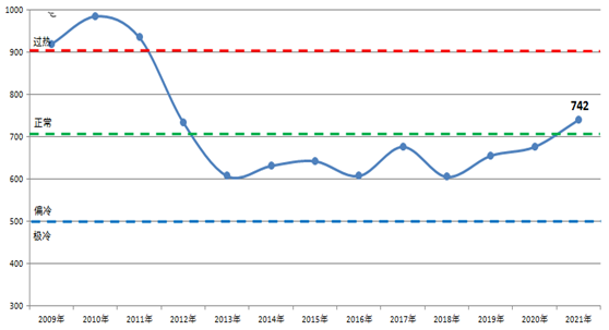 2021年中國造船產能利用監(jiān)測指數(CCI)742點,與2020年相比提高64點,同比增長9.4%,自2012年以來首次回升至正常水平線以上。
