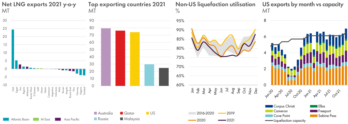 在供給方面,2021年,LNG出口量位居前三位的仍然是澳大利亞、卡塔爾和美國。特別值得一提的是,去年美國LNG出口增量位居世界第一,同比增長2400萬噸,達到7360萬噸,專家預計2022年美國有望超過澳大利亞成為全球最大的LNG出口國。