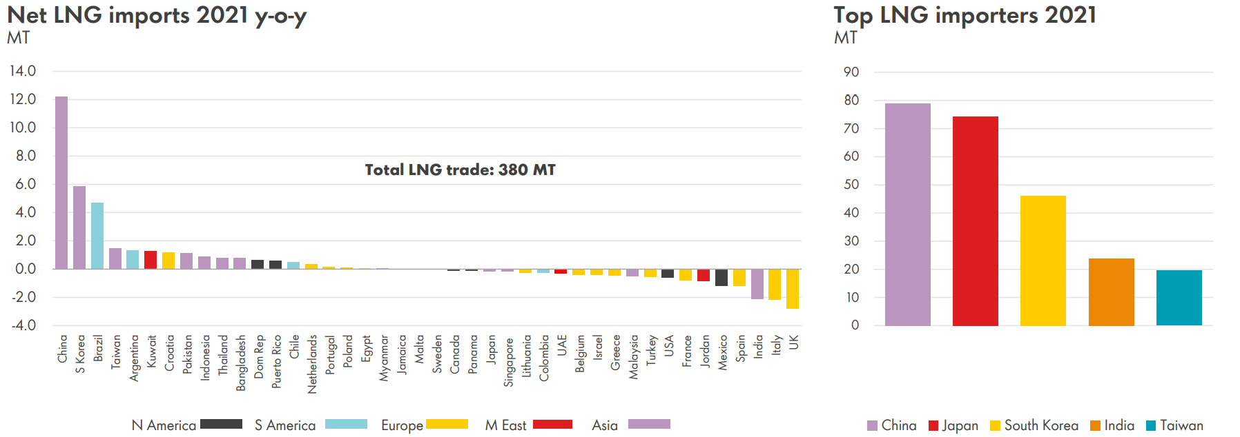 在需求方面,2021年,中國、韓國和日本繼續(xù)引領(lǐng)LNG需求的增長。中國的LNG進口量增加了1200萬噸,達到7900萬噸,超過日本成為世界上最大的液化天然氣進口國。