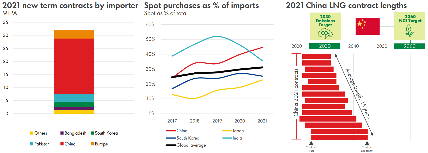 2021年,中國的LNG買家簽署了每年超過2000萬噸的長期合同。這表明LNG在關(guān)鍵行業(yè)用能的煤改氣轉(zhuǎn)型, 以及助力中國實現(xiàn)2060年碳中和目標過程中將持續(xù)發(fā)揮作用。