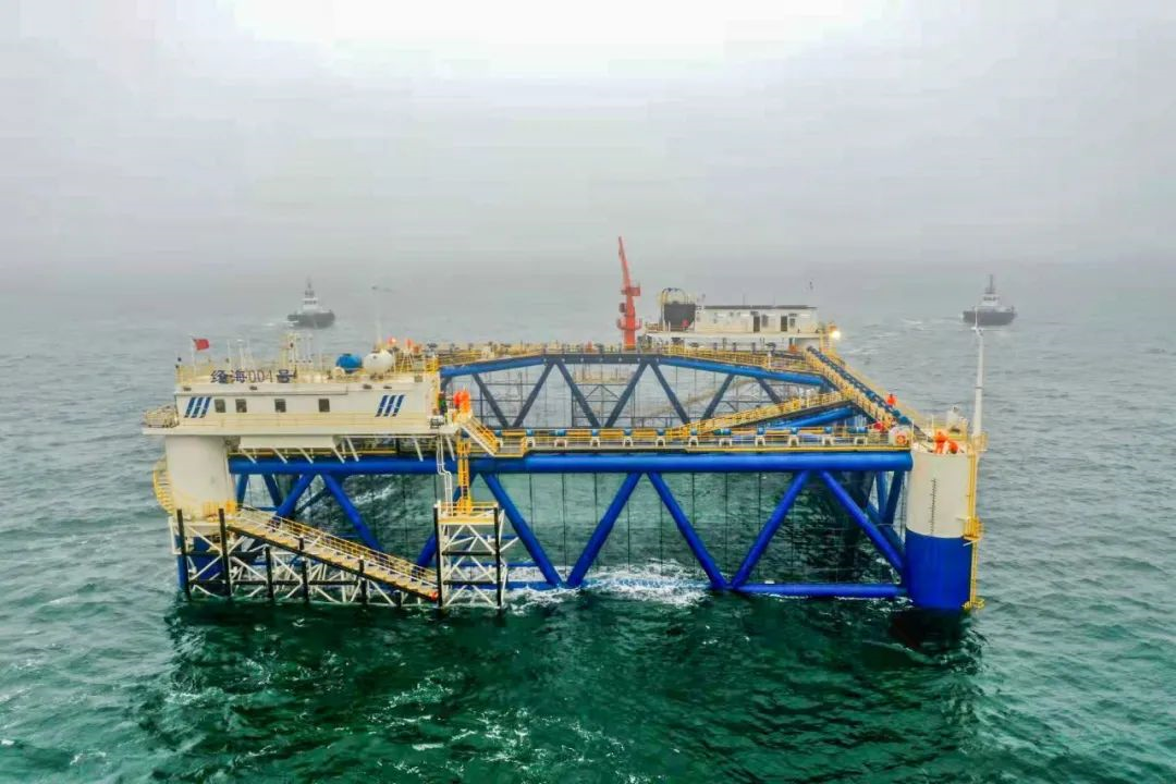 3月11日,中集來(lái)福士為煙臺(tái)經(jīng)海海洋漁業(yè)有限公司建造的“經(jīng)海004號(hào)”智能網(wǎng)箱在南隍城海域完成坐底交付。至此,經(jīng)海漁業(yè)“百箱計(jì)劃”首批4座網(wǎng)箱“經(jīng)海001-004號(hào)”全部順利集結(jié)入駐南隍城島。