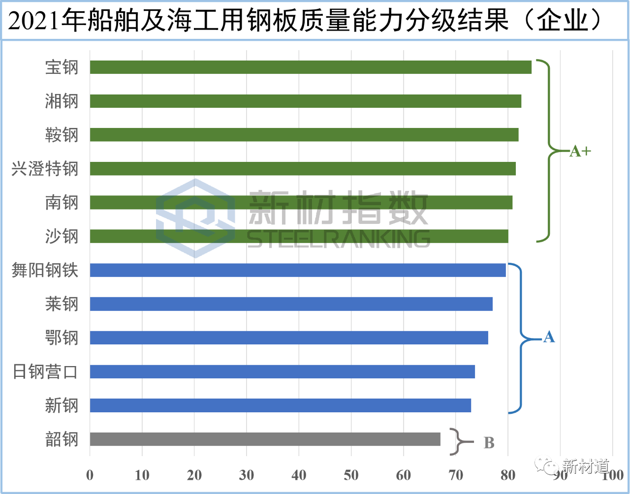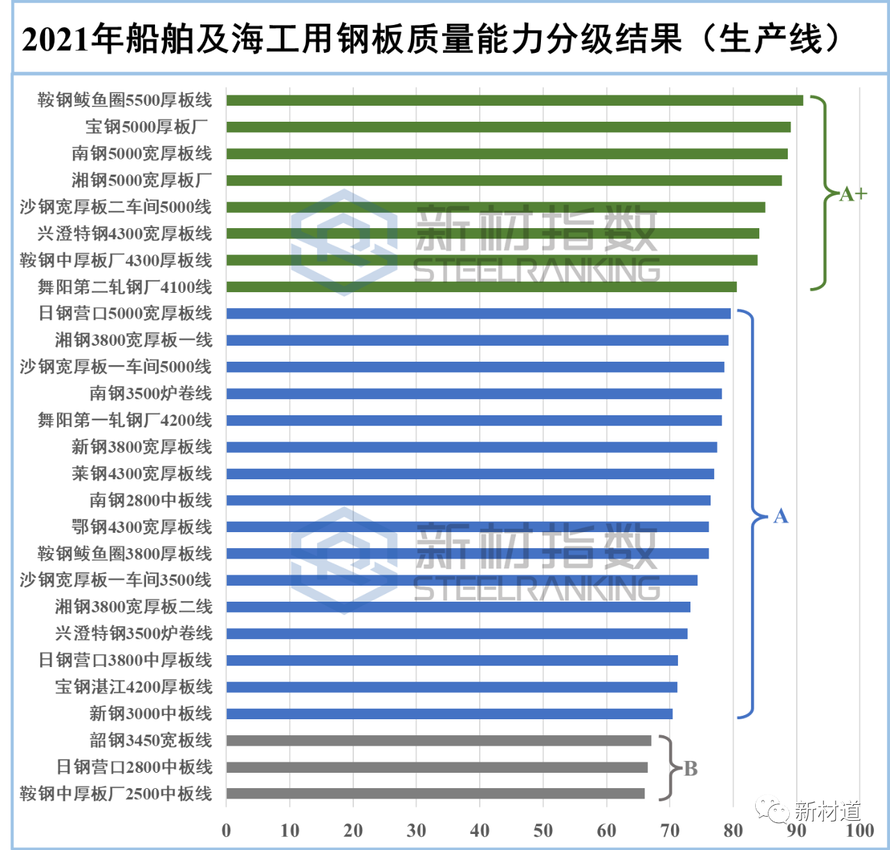 采用鋼鐵產(chǎn)品質(zhì)量能力分級(jí)評(píng)價(jià)方式,對(duì)國(guó)內(nèi)12家主要船舶及海工用鋼生產(chǎn)企業(yè),共27條生產(chǎn)線進(jìn)行了質(zhì)量能力分級(jí)評(píng)價(jià),并發(fā)布了“新材指數(shù)”排名。