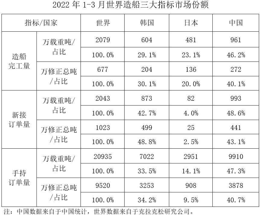 1~3月,我國(guó)造船完工量、新接訂單量、手持訂單量分別占世界市場(chǎng)份額的46.2%、48.6%和47.3%。
