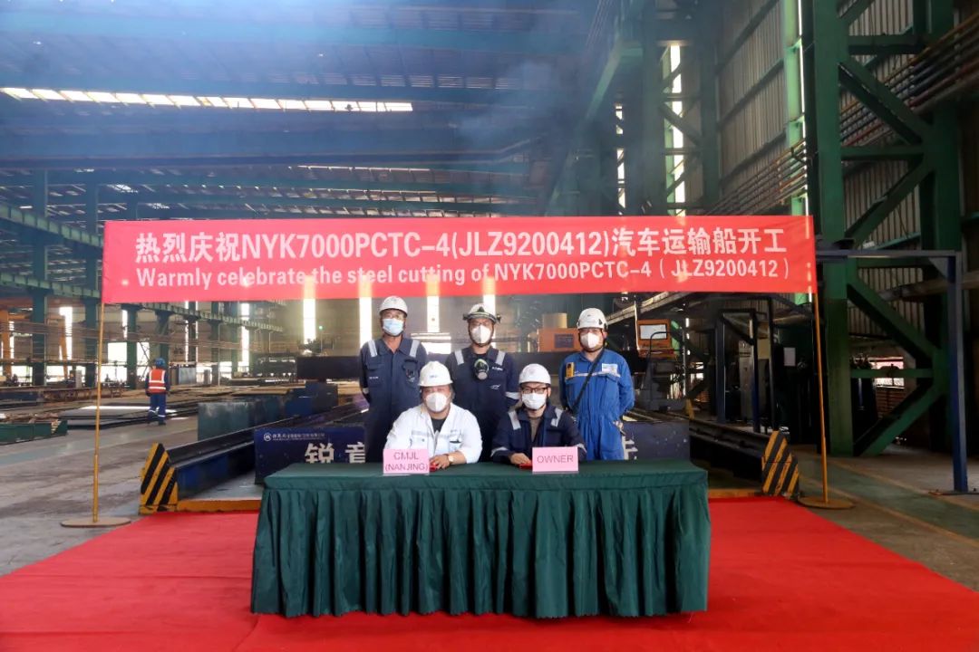 5月6日,招商工業(yè)南京金陵船廠(chǎng)為日本郵船(NYK)集團(tuán)建造的第四艘7000車(chē)位液化天然氣汽車(chē)運(yùn)輸船在儀征廠(chǎng)區(qū)順利開(kāi)工,船東駐廠(chǎng)代表、船級(jí)社駐廠(chǎng)代表及南京金陵項(xiàng)目組有關(guān)人員參加了開(kāi)工儀式。隨著駐廠(chǎng)船東代表Inoue先生按下數(shù)控切割點(diǎn)火按鈕,等離子切割機(jī)下火花飛濺,第四艘7000車(chē)位汽車(chē)運(yùn)輸船正式開(kāi)工。