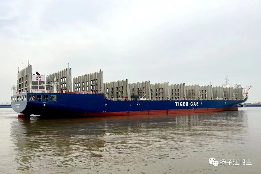 5月15日,揚(yáng)子江船業(yè)集團(tuán)與老虎燃?xì)饴?lián)合研發(fā)由新?lián)P子造船建造的第三艘700箱級(jí)罐箱甲板船“TIGER LIANYUNGANG”輪從碼頭出發(fā)開(kāi)啟首航。