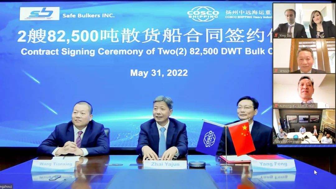 5月31日,揚州中遠海運重工與Safe Bulkers Inc.通過視頻云簽約的方式成功簽署了兩艘由中遠海運重工設(shè)計研究院自主研發(fā)設(shè)計的82500噸散貨船建造合同,這標(biāo)志著中遠海運重工在產(chǎn)品自主研發(fā)道路又前進了一大步。