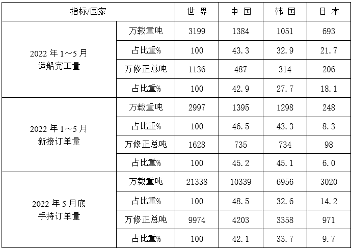 2022年1~5月份世界造船三大指標(biāo)