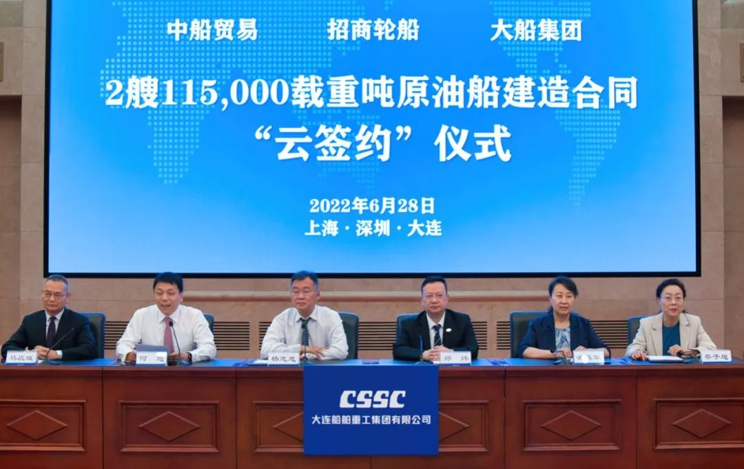 6月28日,中國船舶集團旗下大船集團聯(lián)合中船貿易與招商輪船在大連、上海、深圳三地以視頻形式“云”簽署2艘11.5萬噸原油船建造合同,三方代表在新船建造合同上簽字。招商輪船黨委書記、董事長謝春林,中船貿易黨委副書記、總經理胡凱,大船集團領導楊志忠、鄭煒等出席儀式。