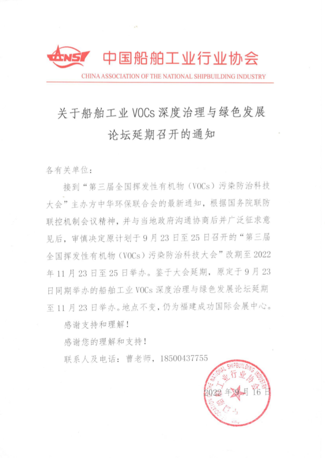 關(guān)于船舶工業(yè)VOCs深度治理與綠色發(fā)展論壇延期召開的通知