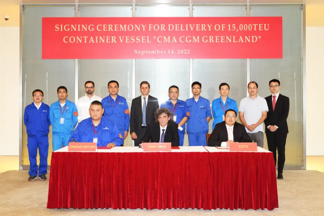 9月14日,中國船舶集團旗下江南造船與中國船舶工業(yè)貿(mào)易有限公司攜手為法國達飛海運集團打造的的15000TEU雙燃料集裝箱船H2658簽字交付。達飛監(jiān)造組、中船貿(mào)易、BV上海地區(qū)及江南造船等相關人員出席簽字儀式。