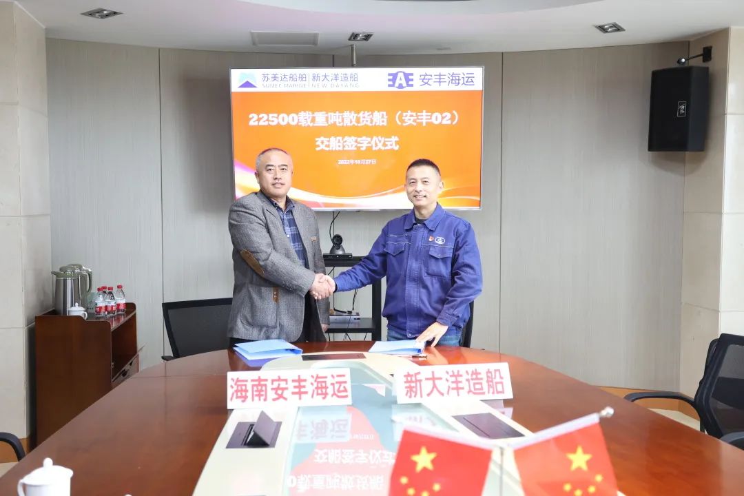 10月27日,蘇美達(dá)船舶有限公司新大洋造船為海南安豐海運(yùn)建造的首制22500載重噸內(nèi)貿(mào)散貨船順利交付,該船是新大洋今年交付的第16艘、累計(jì)交付的第300艘船。蘇美達(dá)船舶有限公司新大洋造船總經(jīng)理徐斌和海南安豐海運(yùn)副總經(jīng)理吳軍強(qiáng)出席交船簽字儀式。