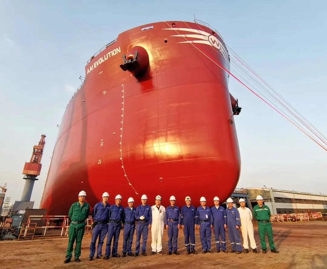 下午,由中船澄西為AAI(SG)PTE公司建造的第2艘82000噸散貨船勝利下水。該船于9月24日上船臺,經(jīng)過各方共同努力,將船臺周期控制在45天。