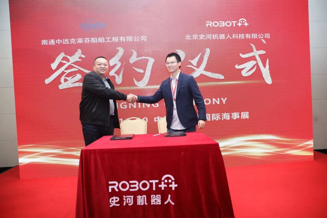 在論壇上,史河機器人發(fā)布了其最新研制的新一代水射流清理機器人HighMate V40。據(jù)悉,史河科技成立于2015年,是一家從事機器人自主研發(fā)的科技公司,也是國內(nèi)第一家實現(xiàn)高空機器人產(chǎn)業(yè)化的企業(yè)。該公司自主研發(fā)的船舶除銹機器人已在國內(nèi)50多家大型修造船企業(yè)得到應用,累計完成超過400艘十萬噸級以上船舶除銹作業(yè),市場占有率居行業(yè)領先地位。相較于上一代機器人V30,新品V40在性能方面有了明顯提升,可實現(xiàn)一鍵換道、自主導航,作業(yè)效率提升20%以上,同時綜合維護成本更低。南通中遠克萊芬船舶工程有限公司副總經(jīng)理楊關杰與北京史河機器人科技有限公司創(chuàng)始人兼CEO許華旸簽署了戰(zhàn)略合作協(xié)議。