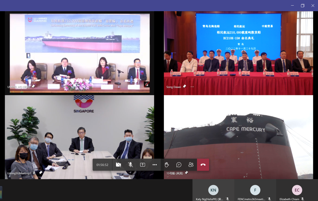 11月29日,青島北海造船和中船貿(mào)易作為聯(lián)合賣方,為裕民航運(yùn)建造的21萬(wàn)噸散貨船15號(hào)船舉行命名儀式。命名儀式以視頻連線方式進(jìn)行,裕民航運(yùn)董事長(zhǎng)徐旭東、總經(jīng)理王書吉,新船命名人李慧萍在臺(tái)北會(huì)場(chǎng)出席儀式,挪威船級(jí)社產(chǎn)品部門經(jīng)理張震,青島北海造船黨委書記、董事長(zhǎng)陳埥,黨委副書記、副總經(jīng)理谷克超,副總經(jīng)理陳衛(wèi)平、楊樹(shù)振等在青島會(huì)場(chǎng)出席儀式。