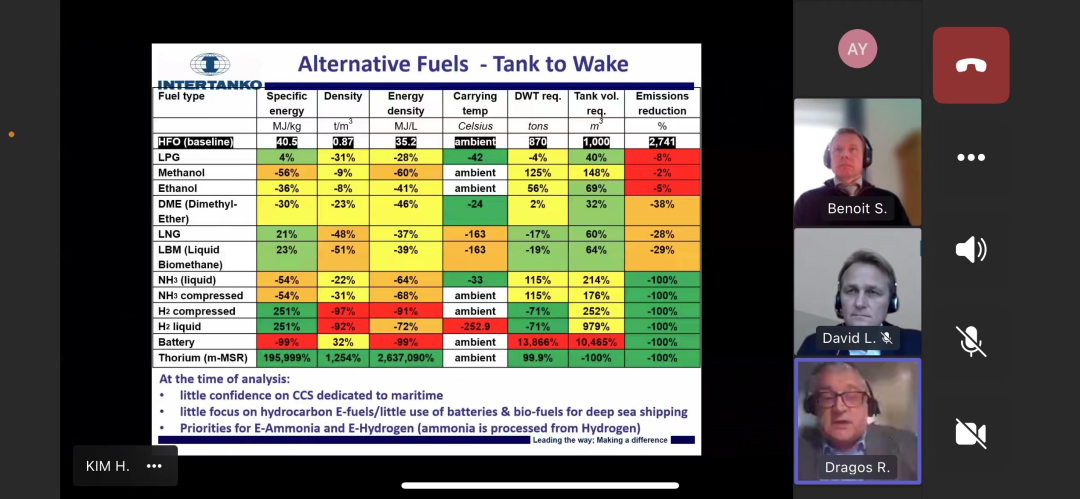 船舶動力與清潔燃料議題,就船舶清潔燃料應(yīng)用、清潔燃料船舶主機及相關(guān)動力技術(shù)、清潔燃料供應(yīng)鏈等問題開展討論。ICS技術(shù)專家Sunil Krishnakumar在發(fā)言中指出,當(dāng)前船舶使用清潔燃料及清潔燃料相關(guān)技術(shù),需要完善的MARPOL、SOLAS等國際規(guī)則規(guī)范與之相匹配,同時要重視對船員的教育培訓(xùn),盡可能減少或避免安全事故。挪威研究機構(gòu)Sintef Ocean的Elizabeth Lindstad博士發(fā)言指出,通過對挪威現(xiàn)有船隊的數(shù)據(jù)模擬分析,風(fēng)帆輔助推進系統(tǒng)結(jié)合船體的優(yōu)化設(shè)計,有助于短途和沿海運輸?shù)闹行⌒痛暗奶紲p排,同時幫助船舶減少5%-10%的運輸成本。ASEF技術(shù)專家韓國現(xiàn)代重工OH Sehun發(fā)言指出,韓國造船業(yè)普遍認(rèn)為氨、甲烷、甲醇是未來重要的船舶清潔燃料,許多造船企業(yè)集團已經(jīng)制定了相應(yīng)的船舶動力技術(shù)路線圖,包括單燃料機和多燃料機(兩種燃料以上)。國際油船船東協(xié)會(INTERTANGO)Dragos Rauta表示,當(dāng)前全球清潔能源生產(chǎn)供應(yīng)能力,還不能完全滿足航運業(yè)實現(xiàn)2050零排放的戰(zhàn)略目標(biāo),業(yè)界應(yīng)該盡快明確船舶應(yīng)用清潔燃料的時間表,并支持能源行業(yè)提升清潔能源的生產(chǎn)供應(yīng)水平。