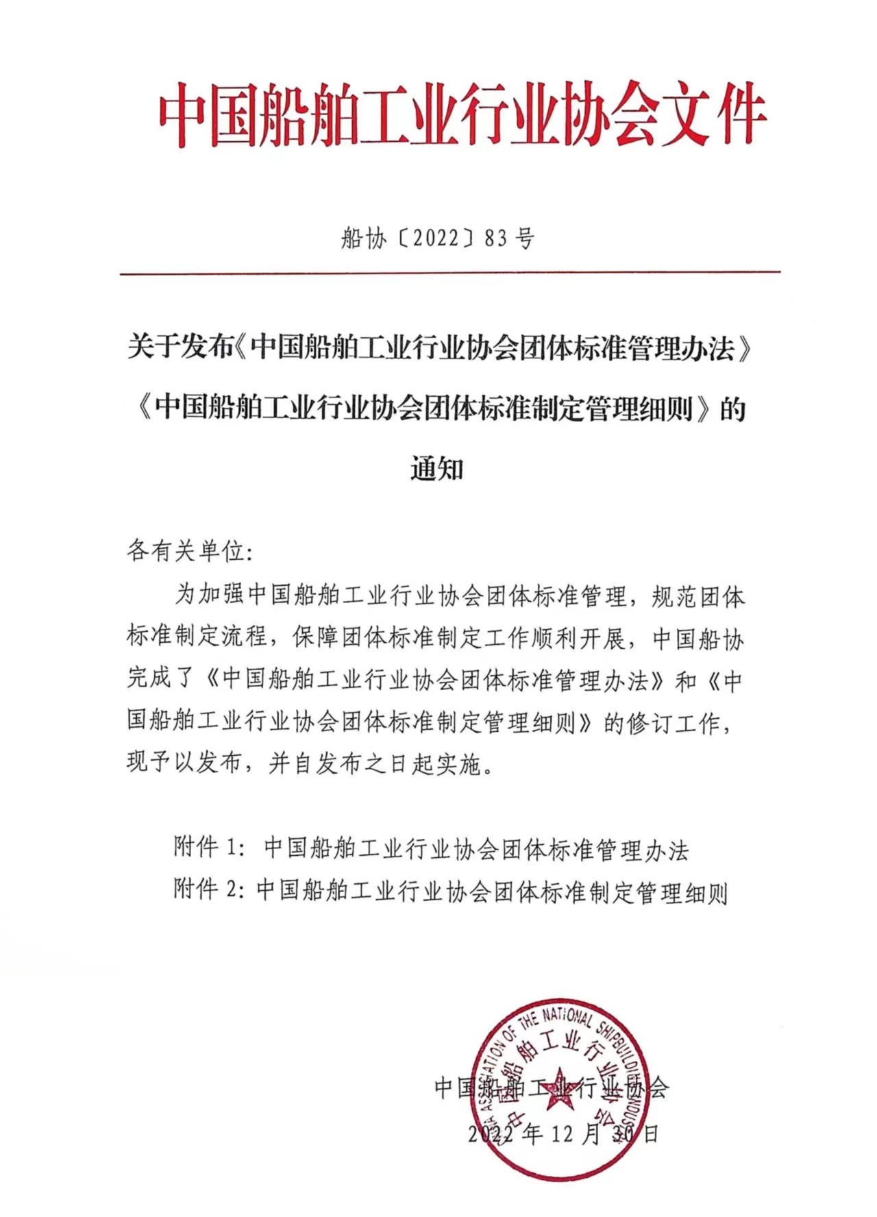 關于發(fā)布《中國船舶工業(yè)行業(yè)協(xié)會團體標準管理辦法》《中國船舶工業(yè)行業(yè)協(xié)會團體標準制定管理細則》的通知