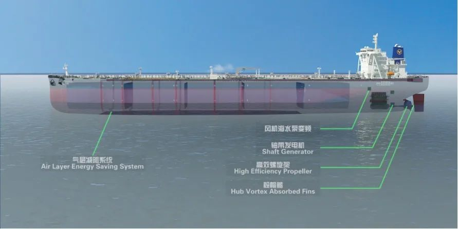 “凱輝”輪是大連船舶重工牽頭,聯(lián)合招商輪船,中國船舶集團(tuán)七〇二所、中船節(jié)能公司(CMES-Tech),以及中國船級社(CCS)等單位,打造的具有節(jié)能、降耗、智能特點(diǎn)的綠色生態(tài)環(huán)保示范船,該船也是世界上第一艘應(yīng)用氣層減阻技術(shù)的VLCC。