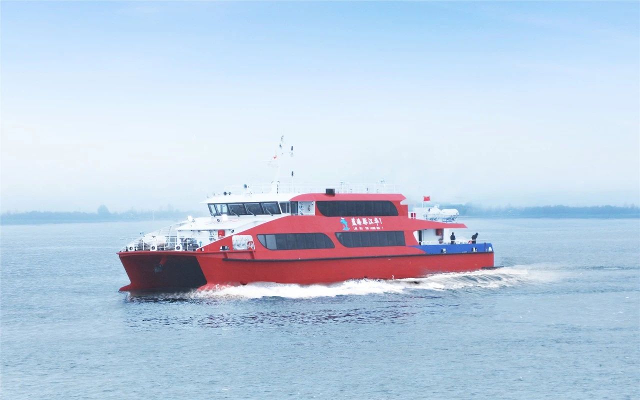 “藍(lán)海豚江華1”是江龍船艇繼“惠嘉華星”輪后,為江華航運(yùn)打造的又一艘全鋁合金雙體結(jié)構(gòu)高速客船,將進(jìn)一步提升粵港澳大灣區(qū)海上旅游交通服務(wù)品質(zhì)。該船總長(zhǎng)40米,型寬10.25米,型深3.5米,采用雙機(jī)雙槳推進(jìn),實(shí)測(cè)滿載平均航速29.6節(jié),客位數(shù)299個(gè),采用經(jīng)典的中國(guó)紅配色,客艙布局舒適寬敞,觀景玻璃窗視野更為開闊,整船具有航行平穩(wěn)、安靜等特點(diǎn),進(jìn)一步提升旅客乘坐的舒適感。