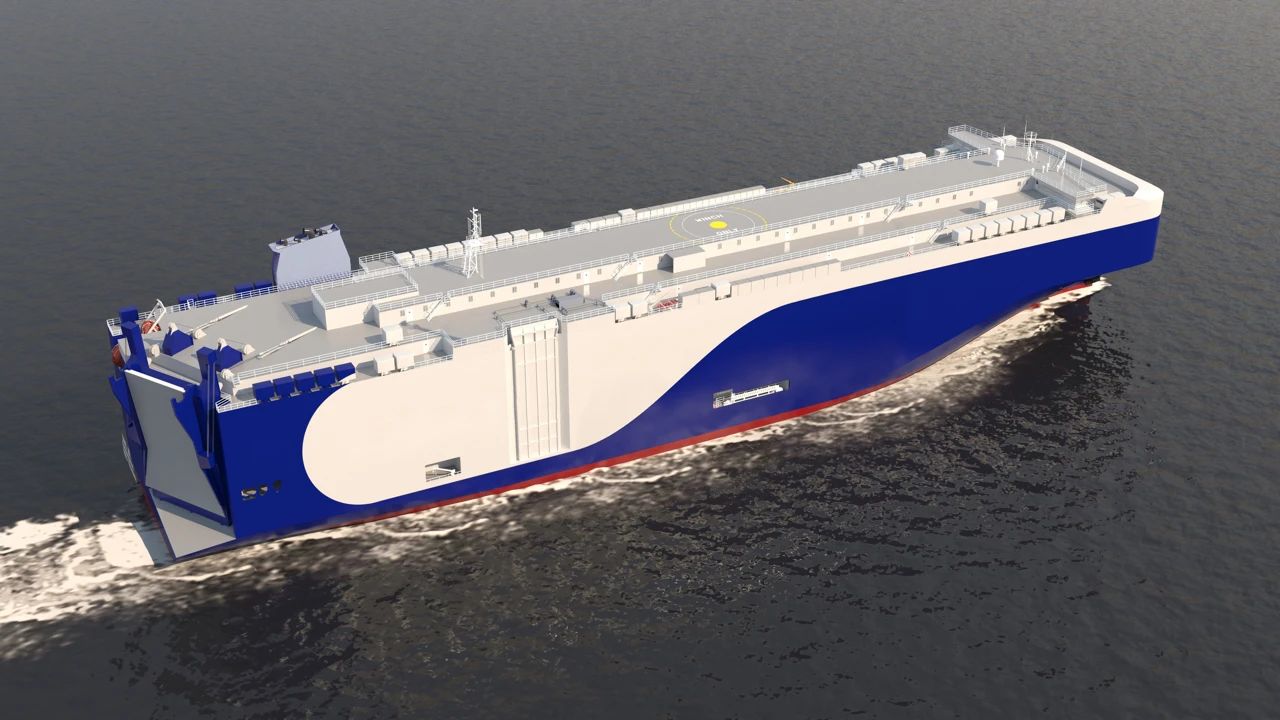 該船型是由上海船舶設(shè)計(jì)院提供設(shè)計(jì),總長(zhǎng)200米,型寬38米,裝載能力為9000車(汽車等效單位),可運(yùn)輸電動(dòng)車和化石燃料汽車以及其他類型的重型滾裝貨物(可高達(dá)250噸)。該系列船配備的新型發(fā)動(dòng)機(jī),可大幅降低油耗,同時(shí)配備扭曲舵、轂帽鰭、節(jié)能導(dǎo)管多種節(jié)能裝置,具有低能耗、綠色環(huán)保等優(yōu)勢(shì);所搭配的中壓岸電系統(tǒng),可在碼頭裝卸貨期間實(shí)現(xiàn)零碳排放;該船經(jīng)改裝后可使用氨做燃料。