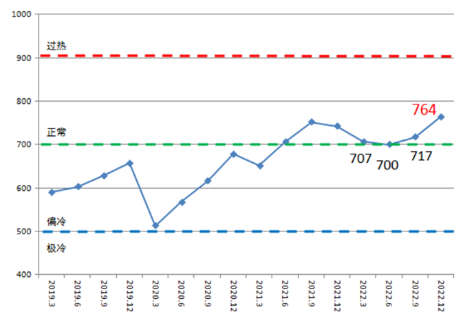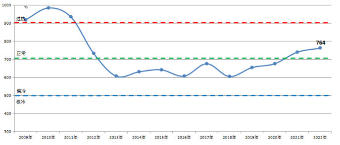 2022年中國造船產(chǎn)能利用監(jiān)測指數(shù)(CCI)764點,達(dá)到近10年以來的最高點,與2021年相比提高22點,同比增長3.0%。