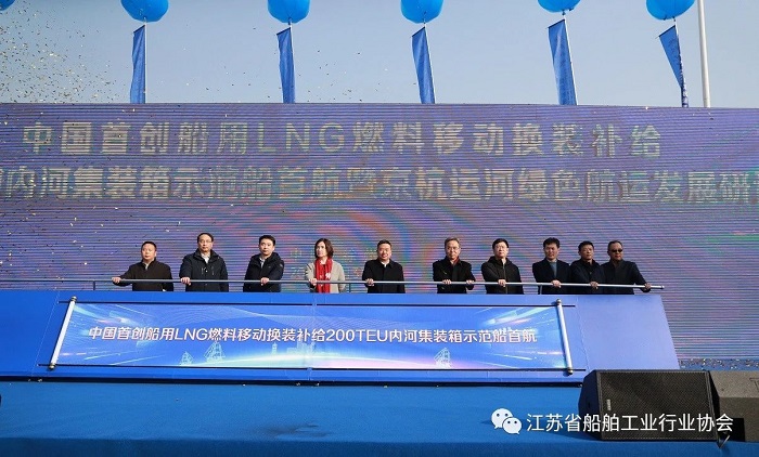 國(guó)內(nèi)首創(chuàng)船用LNG燃料移動(dòng)換裝補(bǔ)給200箱內(nèi)河集裝箱船順利啟航