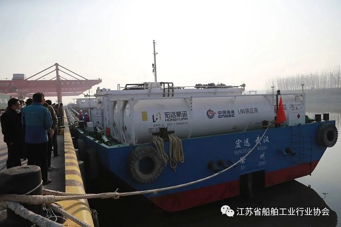 1月31日,由江蘇科技大學(xué)和江蘇現(xiàn)代造船技術(shù)有限公司管義鋒教授團(tuán)隊(duì)設(shè)計(jì)研發(fā)的兩艘移動(dòng)換裝補(bǔ)給200箱純液化天然氣(LNG)動(dòng)力內(nèi)河集裝箱船在徐州正式鳴笛啟航。此次首航的“宏遠(yuǎn)· 徐州”與“宏遠(yuǎn)·武漢”200箱LNG動(dòng)力內(nèi)河集裝箱船,與傳統(tǒng)船用LNG加注方式不同,采用換罐和加注的雙重補(bǔ)給模式,是全國(guó)范圍內(nèi)的首次創(chuàng)新嘗試,這標(biāo)志著“LNG換罐補(bǔ)給模式”正式進(jìn)入船舶燃料補(bǔ)給市場(chǎng)。