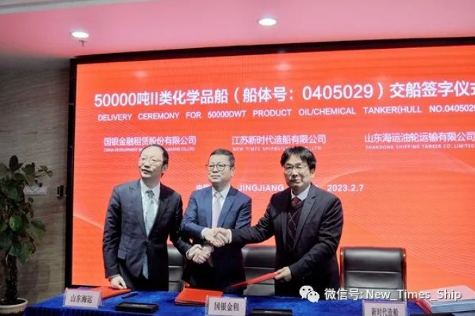 國銀租賃船舶事業(yè)部執(zhí)行董事熊劍鋒表示:今天船舶的成功交付只是合作的開始,國銀租賃將以堅定的態(tài)度,與優(yōu)秀的船廠、優(yōu)秀的伙伴合作,一定會創(chuàng)造出最優(yōu)秀的合作模式,祝福新的船舶一帆風(fēng)順。山東海運副總經(jīng)理徐濤表示:在這充滿希望的春季,29#50000噸Ⅱ類化學(xué)品船成功交付見證了各方良好合作建立的深厚友誼,必將給各方帶來豐碩的成果,讓我們祝愿新船,也讓新船見證我們的友誼。