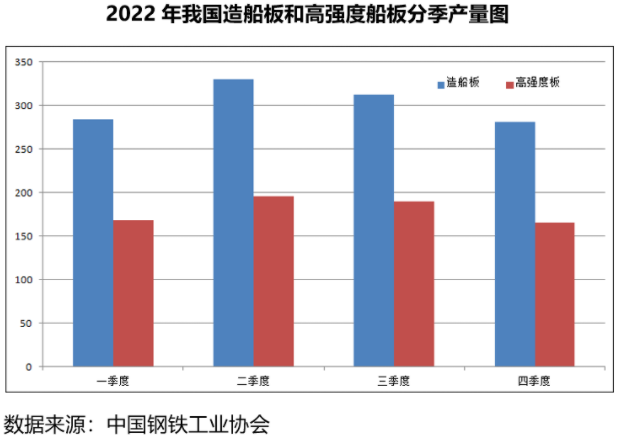 2022年,在我國造船用鋼需求穩(wěn)步回升的帶動下,我國鋼鐵企業(yè)造船板產(chǎn)量大幅提高,月均產(chǎn)量回升至100.6萬噸,達到近7年新高。統(tǒng)計數(shù)據(jù)顯示,2022年,全國造船板產(chǎn)量1191萬噸,同比增加283萬噸,上升31.2%,其中高強度造船板產(chǎn)量696萬噸,同比增加192萬噸,上升38.1%。分季度來看,二季度和三季度造船板產(chǎn)量均超過300萬噸。