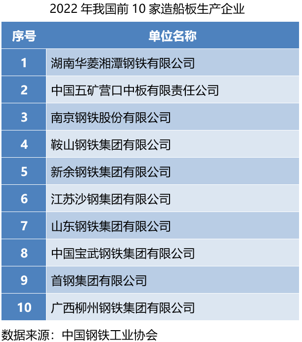 2022年,生產(chǎn)船板的鋼鐵企業(yè)達到18家,其中前十家企業(yè)船板產(chǎn)量達到1119萬噸,同比增長34.8%,高強度板產(chǎn)量達到692萬噸,同比增長37.3%。湖南華菱湘潭鋼鐵有限公司、中國五礦營口中板有限責(zé)任公司、南京鋼鐵股份有限公司、鞍山鋼鐵集團有限公司、新余鋼鐵集團有限公司和江蘇沙鋼集團有限公司造船板產(chǎn)量超過100萬噸;山東鋼鐵集團有限公司造船板產(chǎn)量在去年大幅增長的情況下繼續(xù)增長155%;沙鋼、南鋼和首鋼高強度板產(chǎn)量占造船板比重均超過70%。