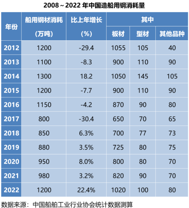 統(tǒng)計顯示,2022年我國造船用鋼總量超1200萬噸,同比大幅增長22.4%,自2017年以來,造船用鋼量首次回升至1000萬噸以上。按品種來看,板材1020萬噸,同比增長24.4%,型材100萬噸,同比增長11.1%,其他品種80萬噸,同比增長14.3%。