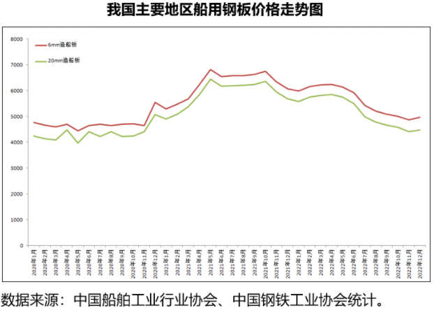 2022年,全國粗鋼產(chǎn)量約10.15億噸,同比減少1770萬噸,降幅1.7%,隨著國內(nèi)鋼材整體需求轉(zhuǎn)入下行通道,鋼鐵產(chǎn)能和產(chǎn)量將會進一步縮減;同時,鐵礦石、焦炭和廢鋼等原材料供給處于相對偏寬松的局面,成本對鋼價的支撐作用有限,因此,從供給端來看,造船板價格不具備大幅度上漲的空間。從需求端來看,這兩年是我國船企船舶建造的高峰年份,對造船板的需求將保持高位,因此,船板價格也不具備大幅度回調(diào)的可能。綜上所述,預(yù)計船板價格將在相對穩(wěn)定的區(qū)間內(nèi)波動。