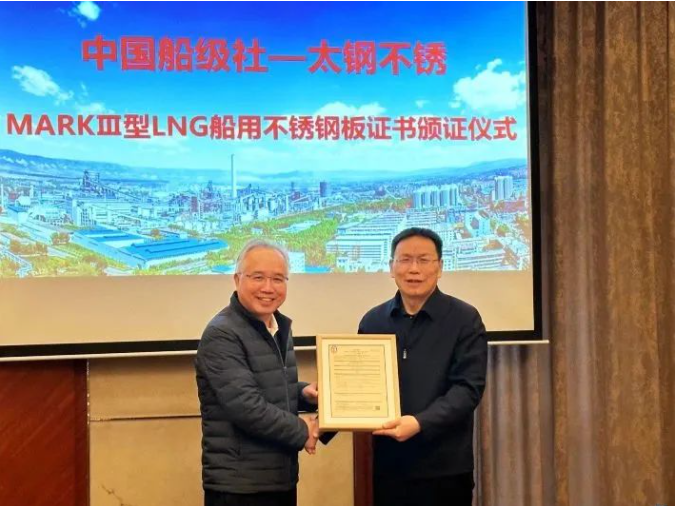 2月28日,中國(guó)船級(jí)社(CCS)為山西太鋼不銹鋼股份有限公司(簡(jiǎn)稱(chēng)“太鋼不銹”)研發(fā)生產(chǎn)的MARK III型專(zhuān)用不銹鋼板(簡(jiǎn)稱(chēng)“MARK III鋼板”)頒發(fā)工廠認(rèn)可證書(shū)。這是CCS簽發(fā)的首張MARK III鋼板工廠認(rèn)可證書(shū),太鋼不銹也成為國(guó)內(nèi)首家具備MARK III鋼板生產(chǎn)能力和資質(zhì)的企業(yè)。CCS副總裁范強(qiáng)、總部產(chǎn)品業(yè)務(wù)處負(fù)責(zé)人姜波濤和天津分社副總經(jīng)理房濤,太原鋼鐵(集團(tuán))有限公司總工程師李建民等出席頒證儀式并進(jìn)行座談交流。