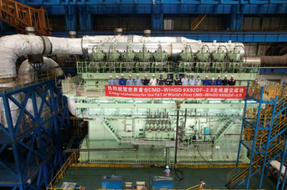 2023年3月13日,由中國船舶集團(tuán)旗下中船動力(集團(tuán))有限公司下屬上海中船三井造船柴油機(jī)有限公司建造的全球首制CMD-WinGD 9X92DF-2.0 iCER雙燃料主機(jī)順利交付。該主機(jī)將安裝于滬東中華造船(集團(tuán))有限公司為CMA-CGM船東建造的13000TEU集裝箱船。
