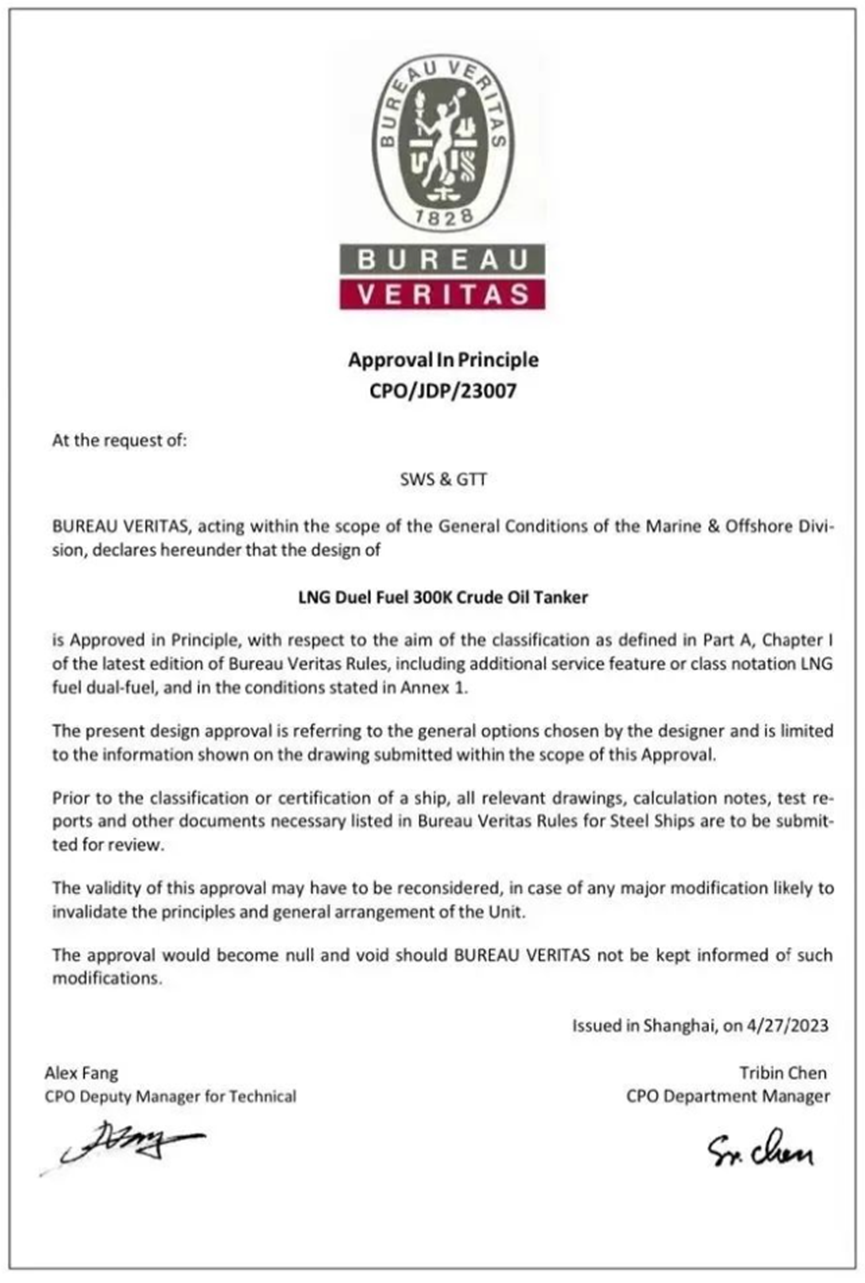 5月5日,外高橋造船同法國GTT公司、BV船級社聯(lián)合研發(fā)的30萬噸雙燃料超大型原油船獲得BV船級社的原則性認(rèn)可(AIP)證書。