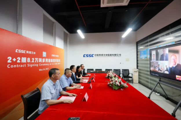 近日,中國船舶集團(tuán)屬下中船黃埔文沖船舶有限公司聯(lián)合中國船舶工業(yè)貿(mào)易公司與挪威Grieg集團(tuán)簽署2+2艘8.2萬噸多用途船建造合同,船東公司、中船貿(mào)易公司、黃埔文沖公司等單位領(lǐng)導(dǎo)共同出席此次云簽約儀式。