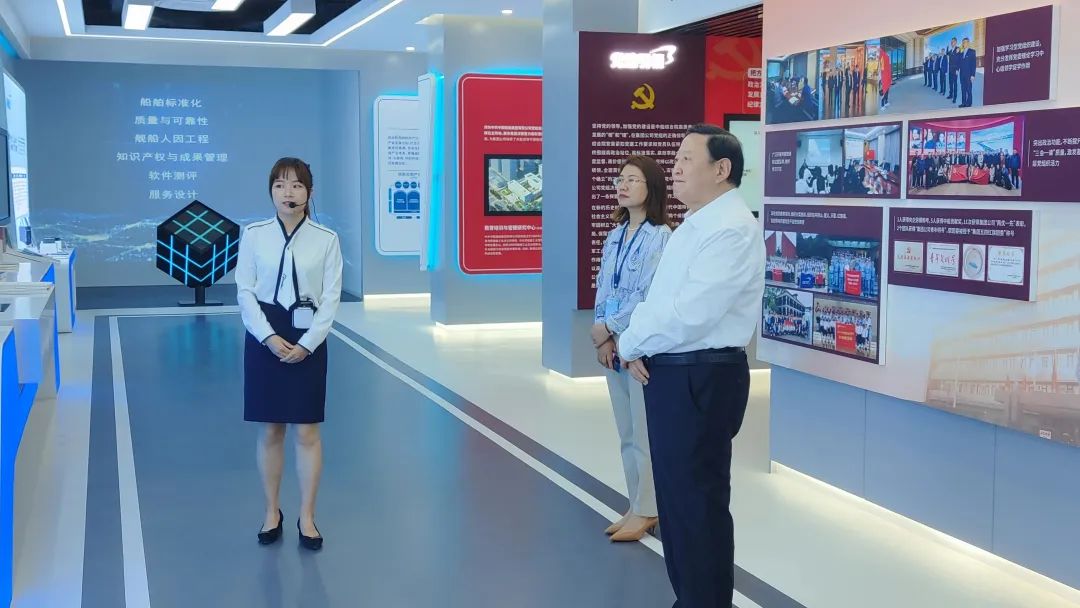 安振剛一行參觀了中船綜合院院區(qū)和展廳,韓笑妍介紹了中船綜合院發(fā)展歷史,各個(gè)專業(yè)方向的特色和圍繞建設(shè)“一流行業(yè)智庫、一流基礎(chǔ)院所、一流央企黨校”所取得的成績(jī)。